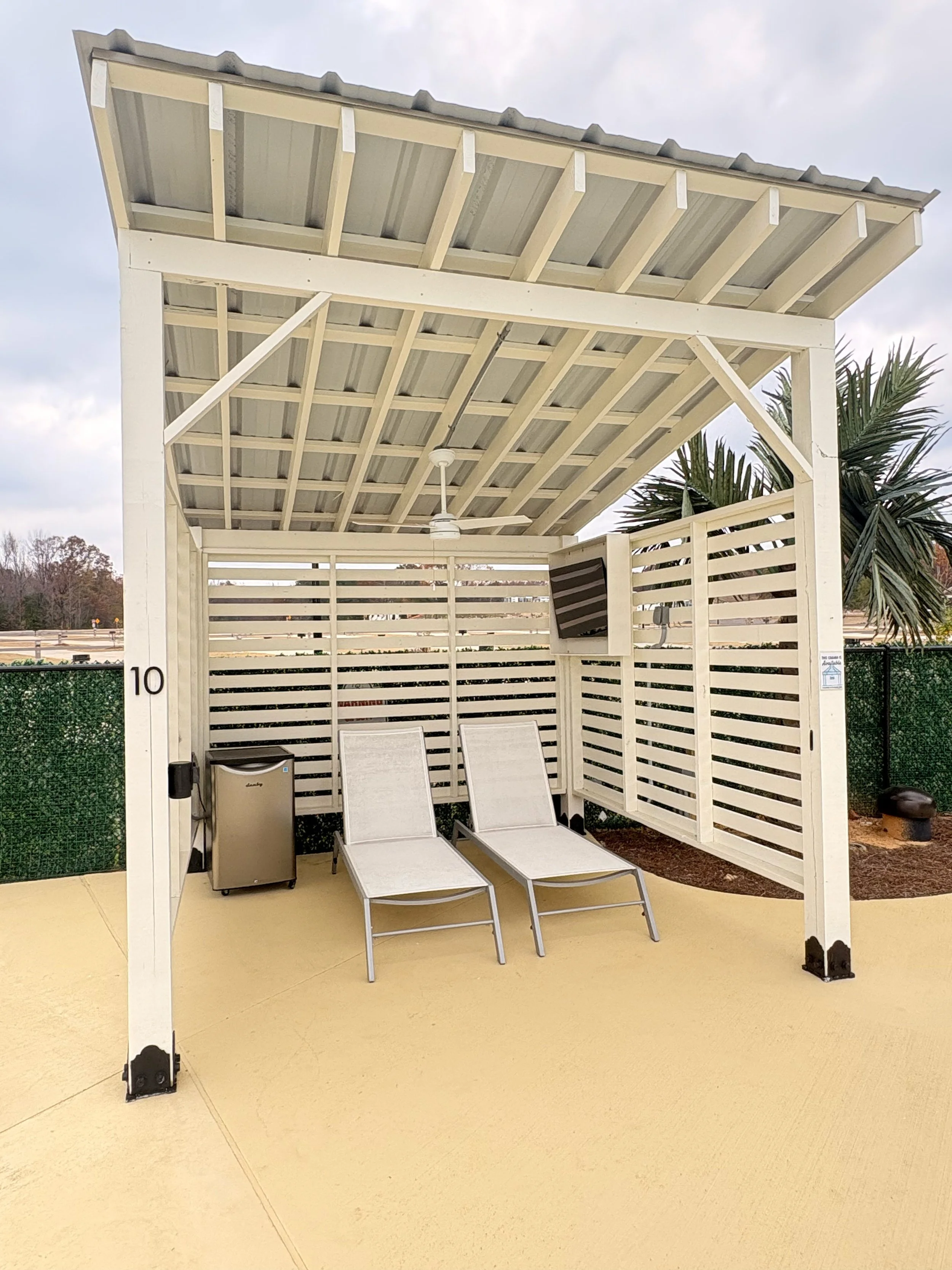 Lounge by the pool in a private, shaded pool cabana! Located adjacent to the upper deck pool and hot tubs, our pool cabanas are equipped with a mini fridge, TV with a DVD player, ceiling fan/light and beautiful, comfortable patio furniture.