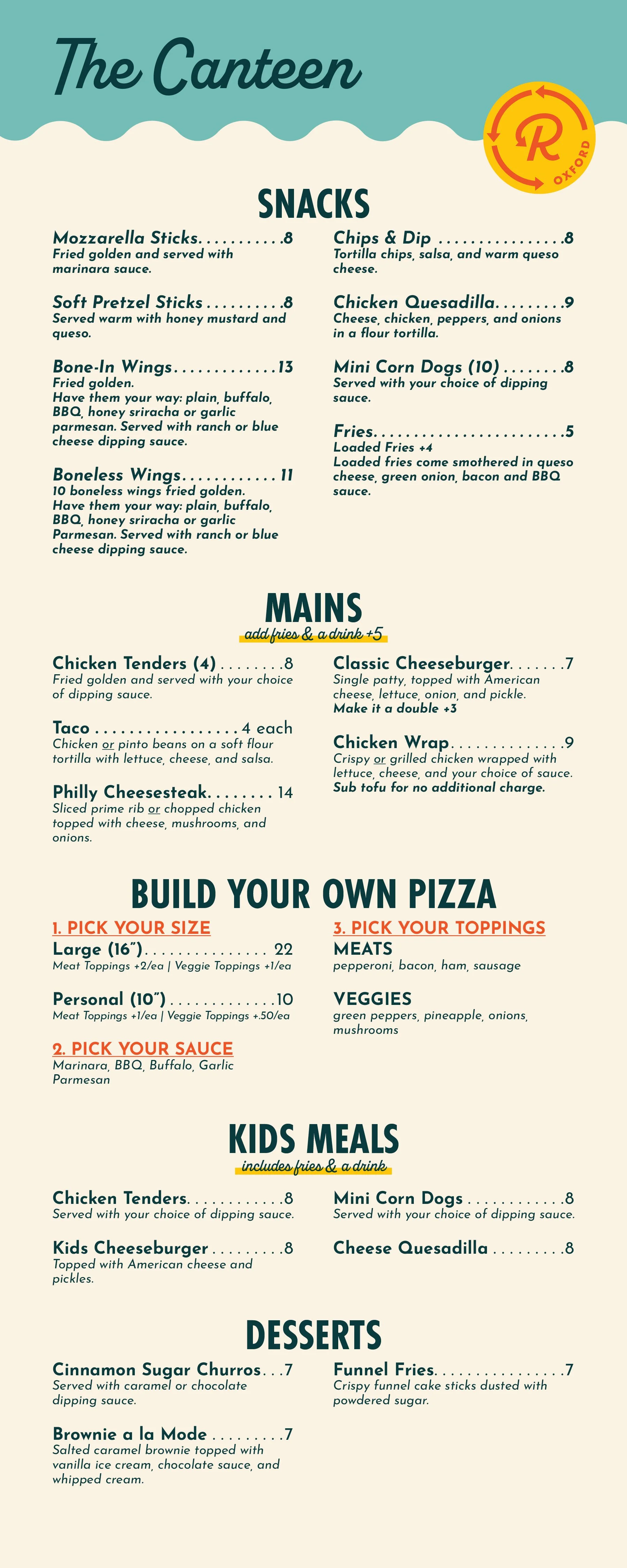 The Canteen is the main dining hub at Roundabout Oxford. With service windows facing both the Family Pool and Adult Pool, guests will find a range of casual dining options. Nestled in the Grand Lodge, it is the go-to destination to grab a quick bite!